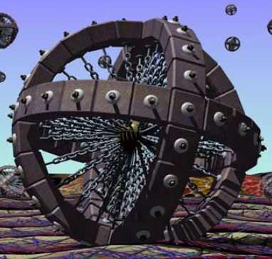 肯尼斯这次参展的数码雕塑作品是对微观物质世界原子结构的幻想。对于这个主题他已经研究了48年。我个人对这个时间的长度怀着足够的敬意。从下面我所摘录的部分插图可以看到肯尼斯为之着迷的结构与秩序:切线和环形构成极为优美的节奏变化和衍生模式。